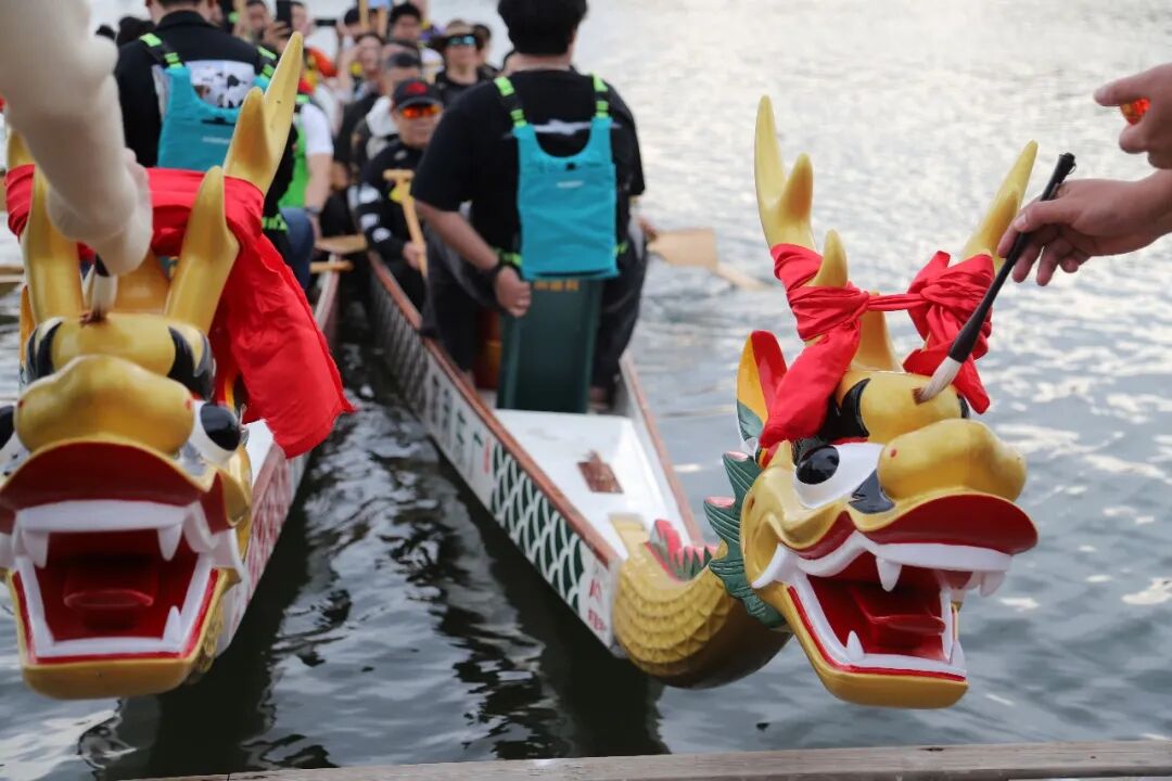 下午3点,汕头市龙舟训练基地热闹非凡。主持人声音洪亮有力,宣布点睛仪式开始。特邀嘉宾与汕头市龙舟运动协会会长黄锦潮神色庄重,走到龙舟旁。主持人念诵祈福之词:“一点天庭,吉星高照、鸿运当头;二点眼睛,眼观六路、一路光明;三点铁角,震威山岳、气壮山河。” 嘉宾们高举点睛笔,向龙行最高敬意,随后轻点笔尖为龙舟点睛 。点睛礼成,激昂的鼓声随之响起,急促的鼓点振奋人心,众人共祈祖国繁荣、百姓安康。
