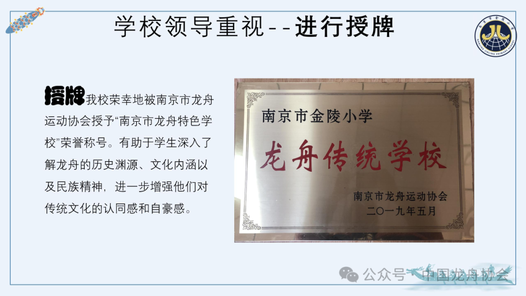 1.在端午节等传统节日,开展《我来说--龙舟》的主题班会活动,国旗下演讲,龙舟绘画等一系列主题活动。让学生在庆祝传统节日的同时,亲身体验龙舟运动的文化内涵。2.我校教师主动承担起了编排龙舟大课间活动的任务,其中包括龙舟操和龙舟素质练习操,实现全员参与的宏景,旨在进一步弘扬传统文化,提高学生身体素质,促进学生全面发展。曾在2023年中华龙赛上、区运动会开幕式上以及南京市少儿节目表演活动中,学生的整齐划一,默契的配合,引得全场一片沸腾。