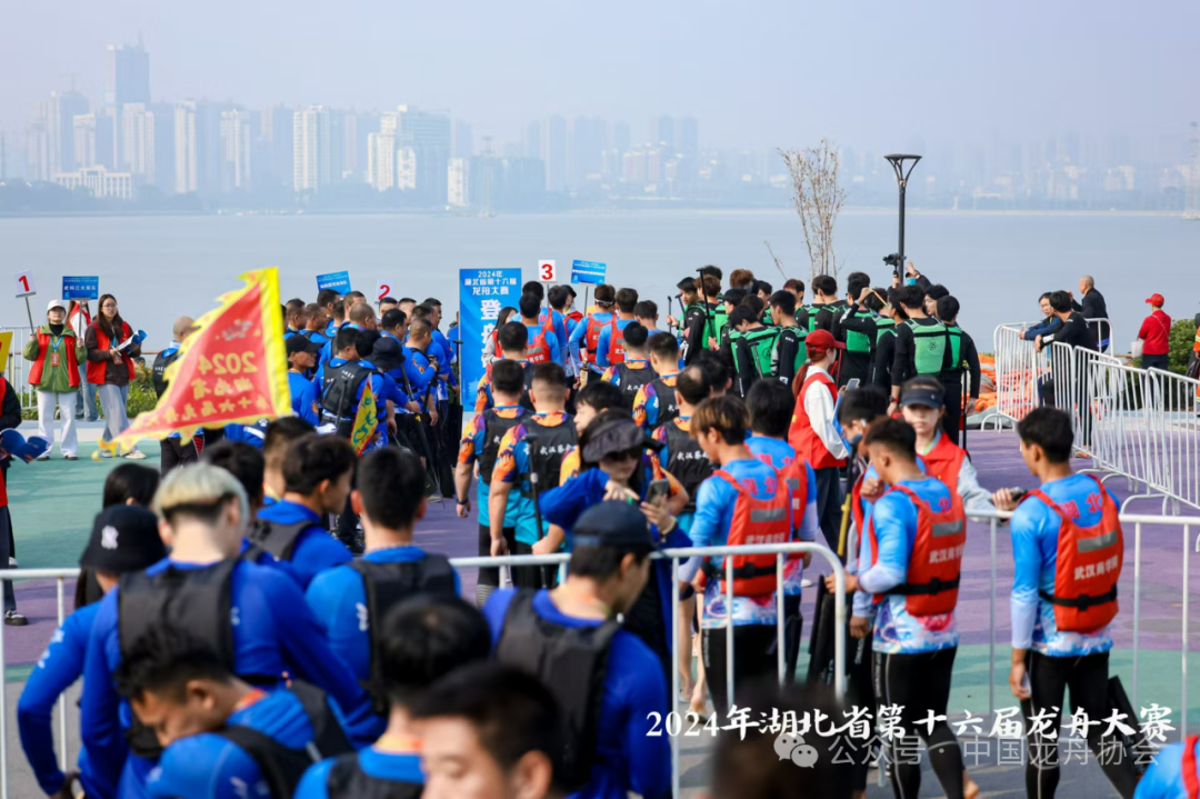 竞技拼搏展风貌,31支参赛队伍分别由12支高校代表队,和19支省内市州龙舟代表队组成,其中12支高校代表队中有7支队伍均来自洪山区,包括华中科技大学、武汉大学、武汉体育学院这类老牌龙舟队,也有武汉科技大学、武汉交通职业学院、武昌工学院这类新生队伍。“花甲队员”和“00后健儿”同台竞技。他们各自身着统一的服装,精神抖擞,身姿挺拔如松,目光坚定自豪。在整个参赛队伍中,有一支平均年龄49岁的龙舟队--仙桃襄河龙舟队,鼓手兼领队刘银花,是本次龙舟大赛中年龄最大的参赛选手。“我们这群‘老伙计们’几乎没有接受过专业训练,我们组队参加龙舟赛,完全是‘为爱发电’。他说,“我们只跟自己比,每场比赛赛出风格,赛出水平,赢得对手的尊重,这就够了。”