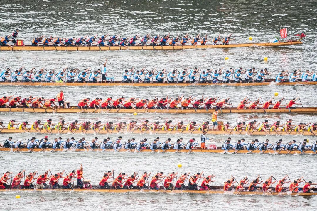 赛龙舟同样也具有这样深厚的群众基础。“一村一船遍一邦,处处旗鼓争飞扬。”这句诗写于宋朝,讲的是各村镇赛龙舟的盛况,放在今天依然十分合适。今年端午前后,广东各地共将举办120多项龙舟赛事活动。很多龙舟活动都由社区或村居自发组织,为了村里的荣誉,队员们可太拼了——在陆地上加练,深夜挑灯夜训,一个个练就了“烧鹅色”皮肤。
